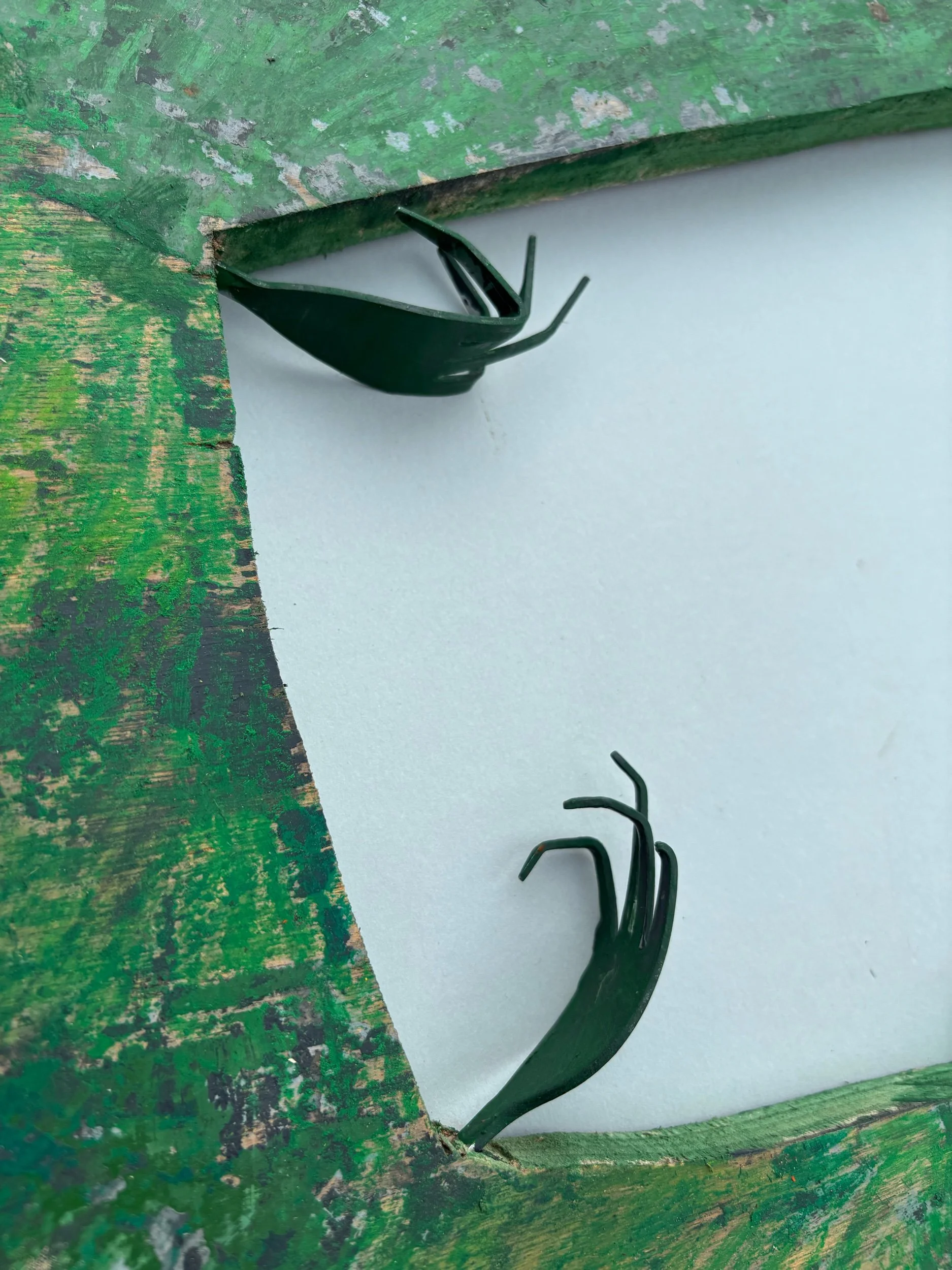 This crazy reptile is cut from a large hefty piece of driftwood ply I found. I could see green under a top layer of black paint, so I scraped it back, cut a shape and a bendy croc was born!