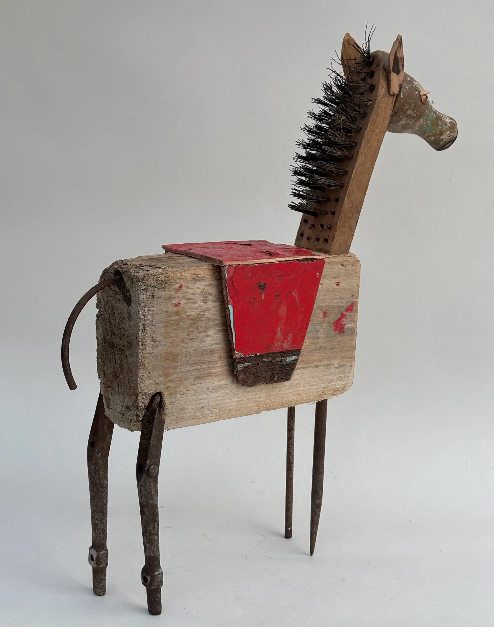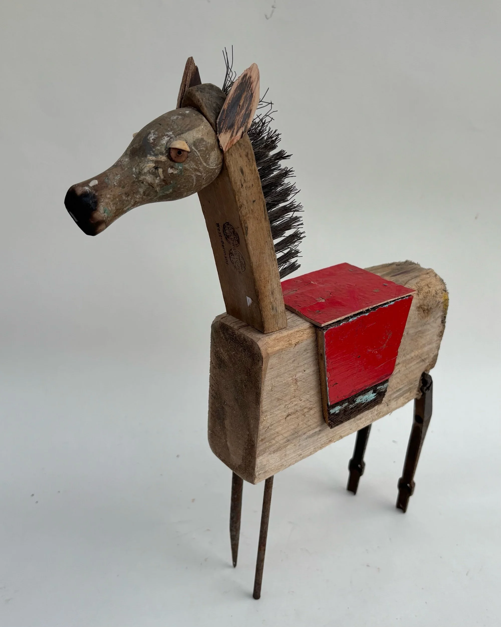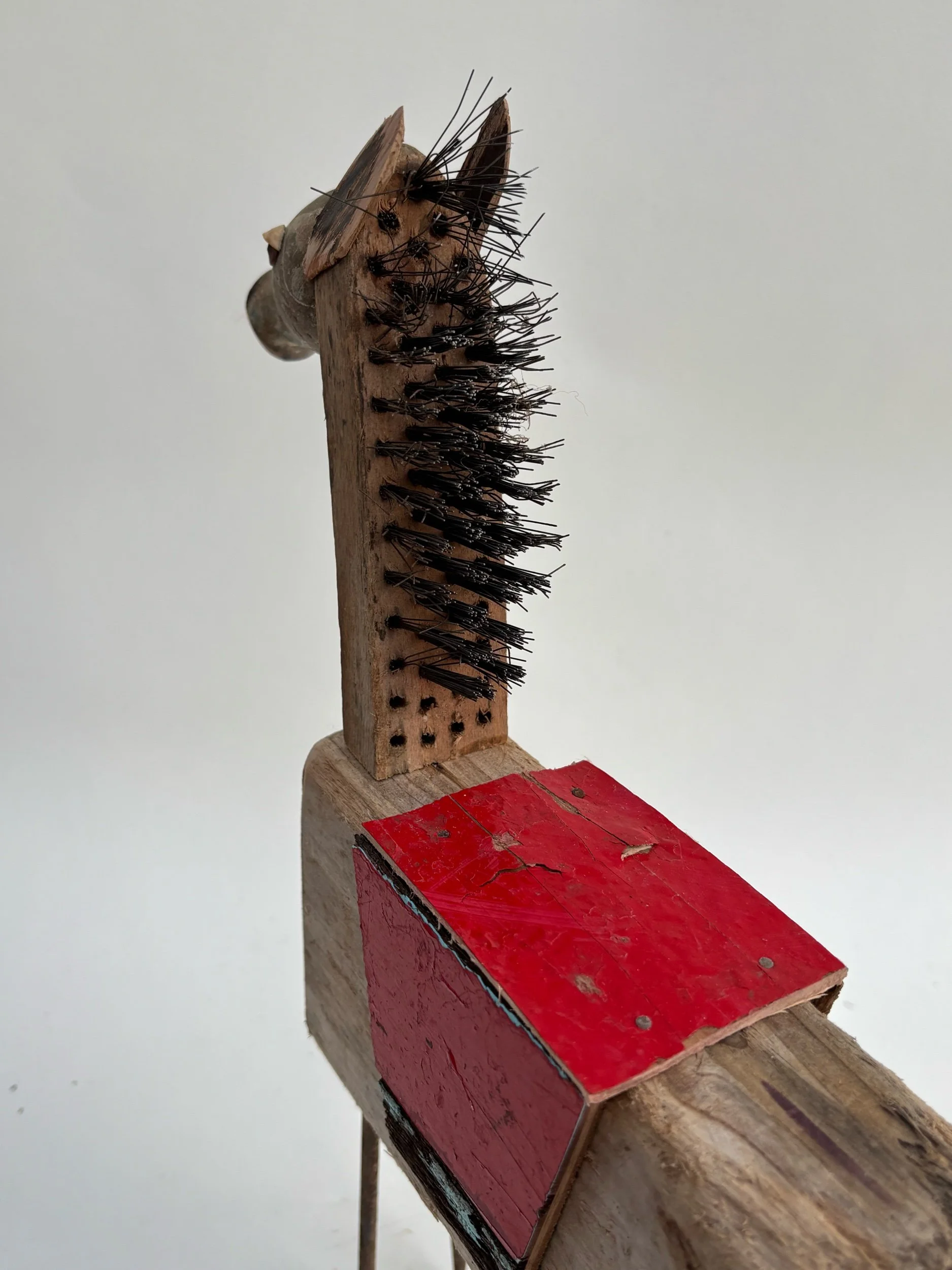 Statuesque horse made from a driftwood block, wire brush, tool handle and parts of a large rusted compass (hence the name).