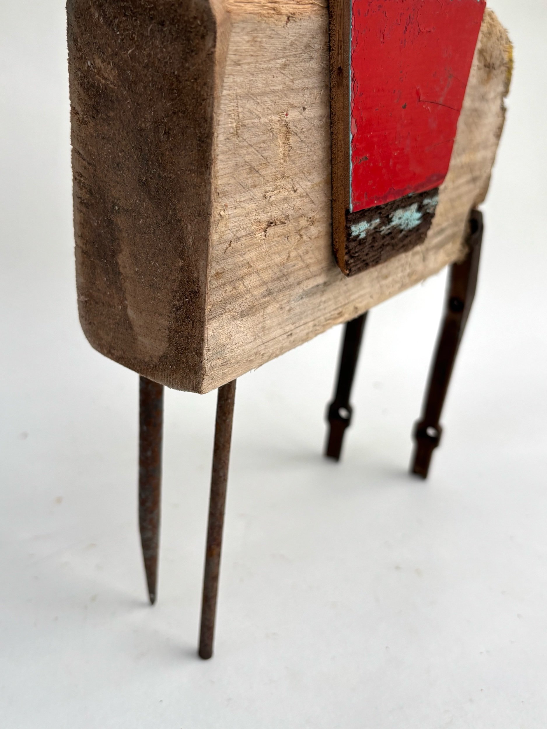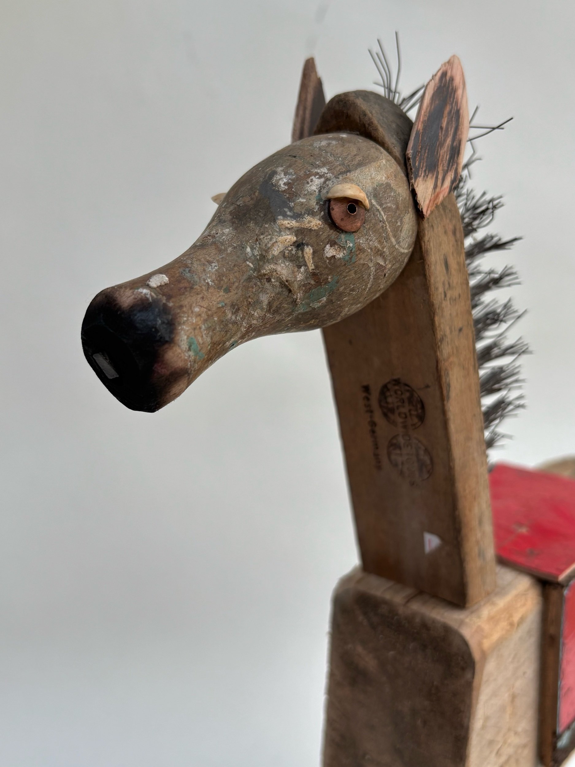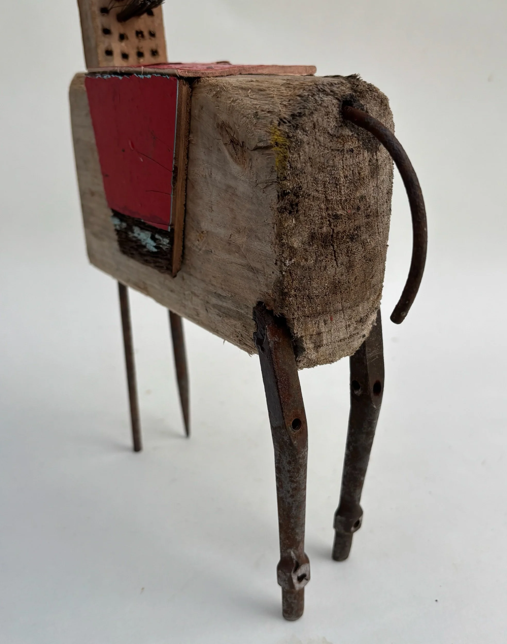 Statuesque horse made from a driftwood block, wire brush, tool handle and parts of a large rusted compass (hence the name).
