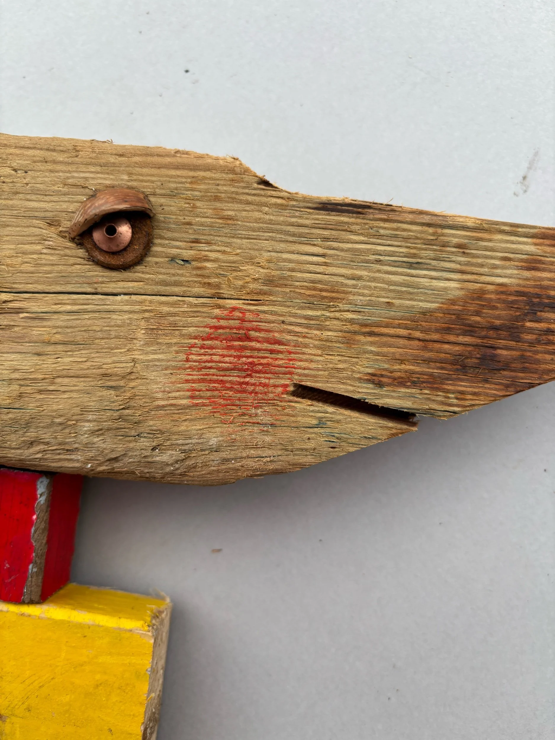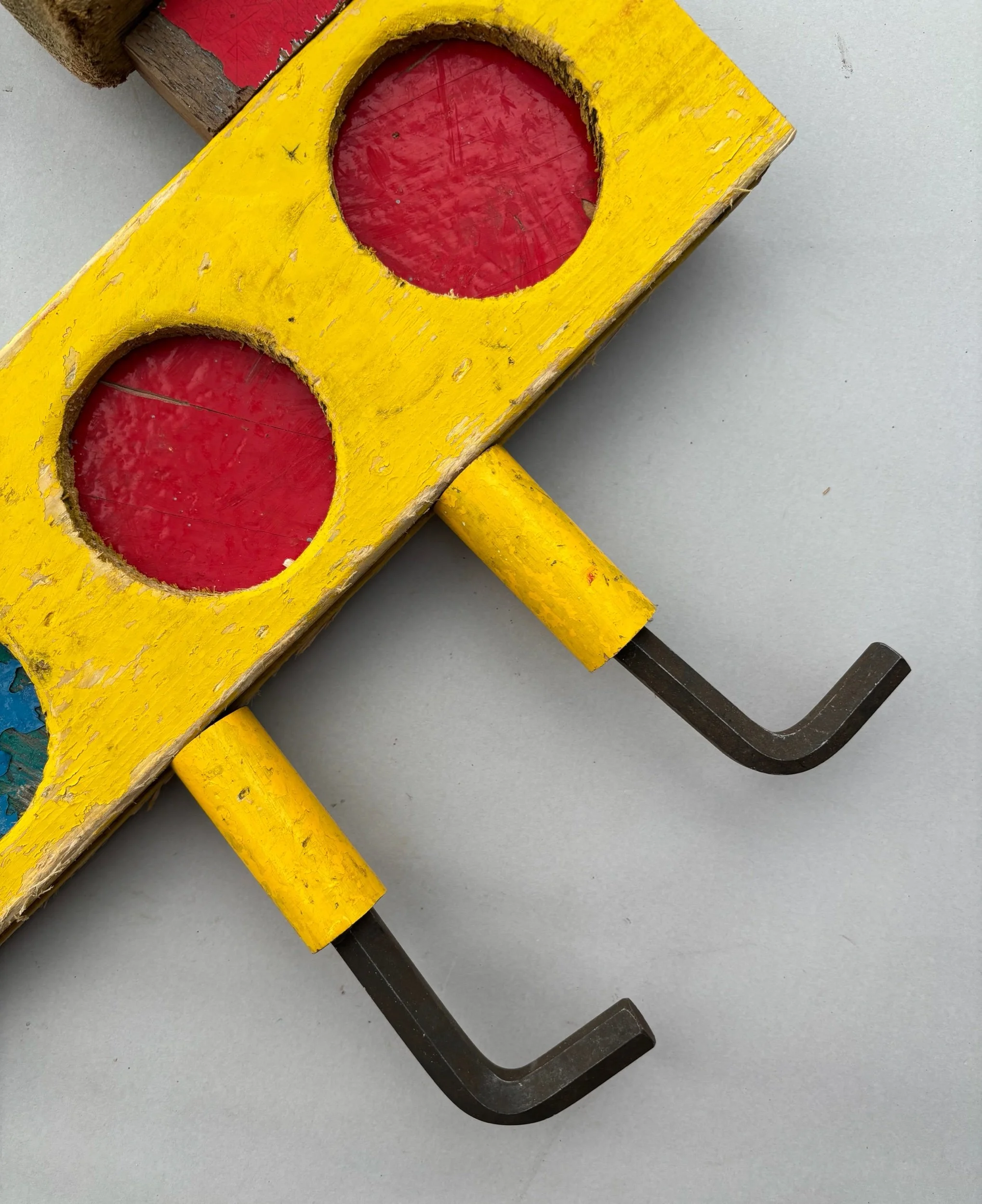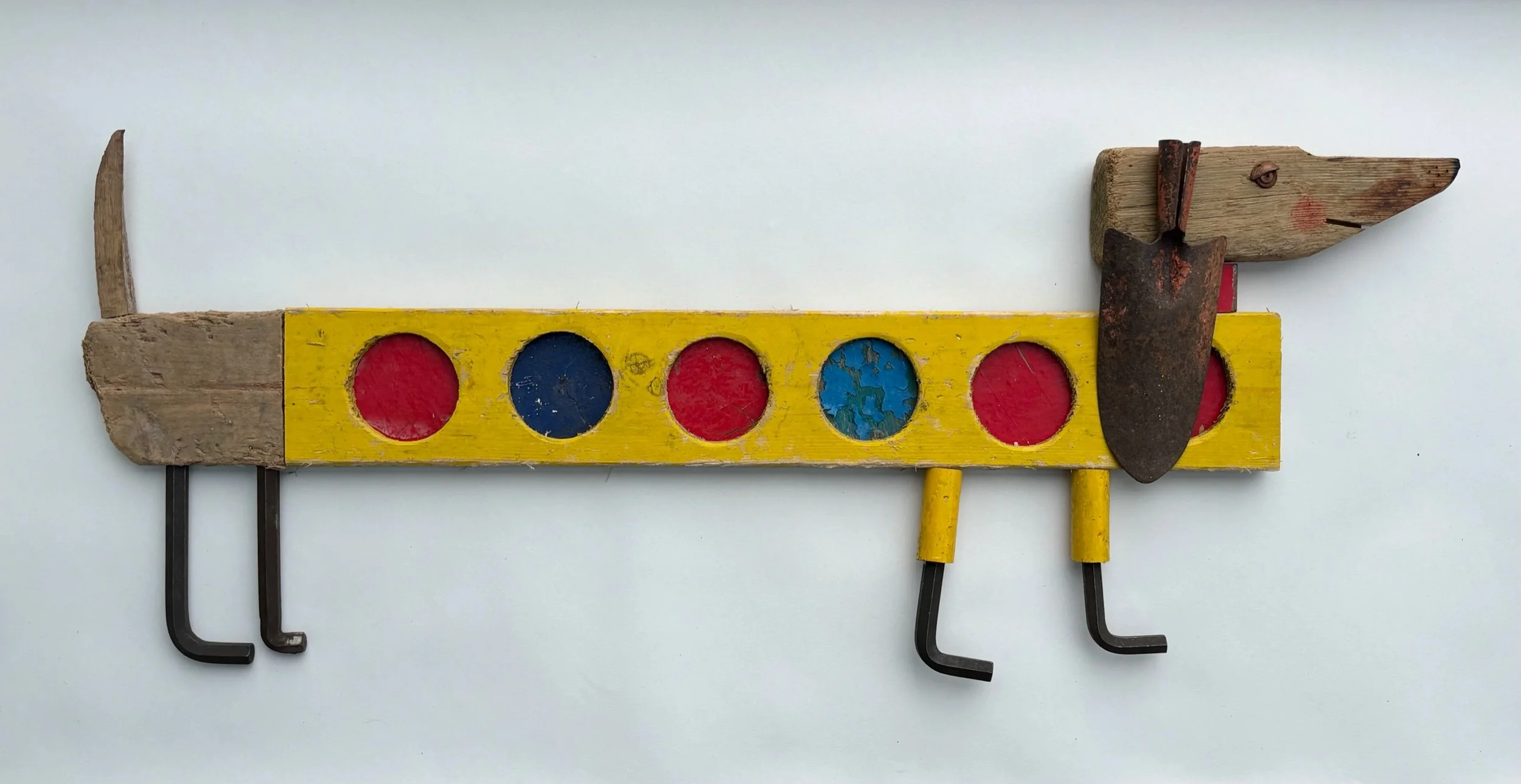 Extra long sausage dog with the funkiest jumper ever, Stretch has an ear made from an old metal trowel that hangs on a little nail and can swing if you want it to!